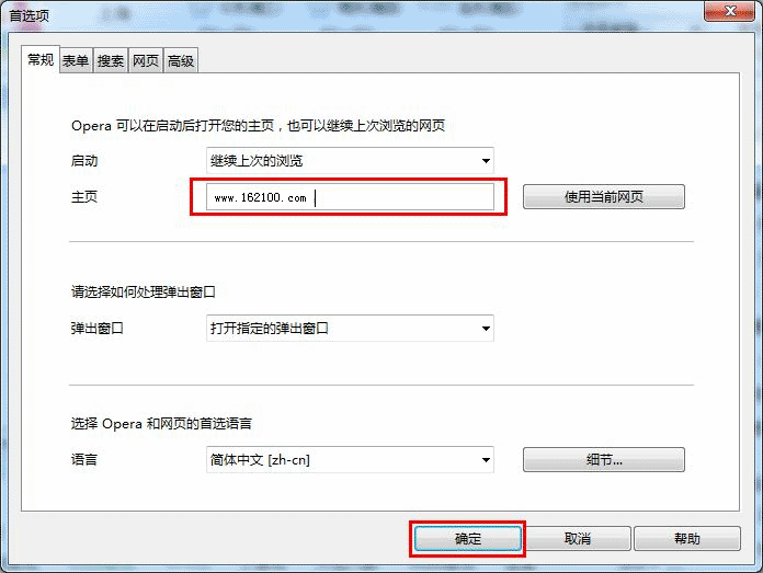 2)然后在打开的对话窗口中的主页栏的主页地址输入框中输入“https://www.7777702.xyz/”,然后点击“确定”按扭即可,如图所示: